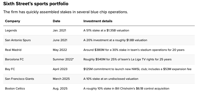 CalPERS just dropped $775 million into Sixth Street’s sports fund. Sixth Street has stated that it will focus (focus?) on “college sports, stadium debt or similar financings, real estate, strategic arrangements, entertainment, media, licensing, data, merchandising, ticketing, sports agencies, talent agencies, sponsorship and other related or adjacent rights and assets.”